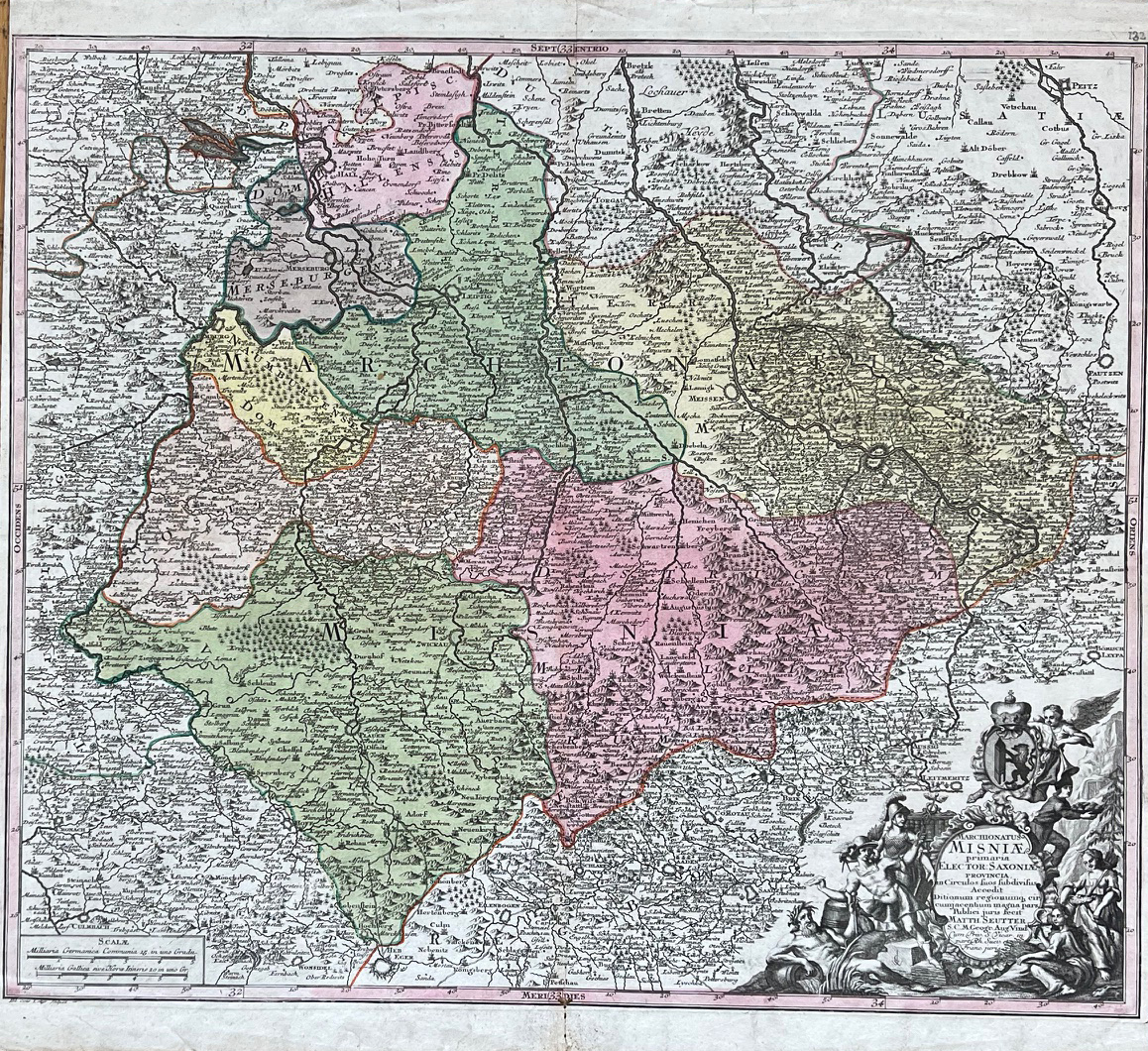 0151-18 SACHSEN - SEUTTER, Mattias. Marchionatus Misniae primaria Elector. Saxoniae Provincia, in Circulos suos subdivisus. Accedit Ditionum regionumque circumiacentium magna pars; Publici juris fecit Matth. Seutter S. C. M. Geogr. Aug. Vind. Matthäus Seutter; 1678-1757; war ein deutscher Kartograf und Kupferstecher sowie Gründer der Druckerei und des Verlages Seutter. Wie vor ihm bereits Homann, erhielt auch Seutter 1731/32 von Kaiser Karl VI. den schönen, aber bedeutungslosen Titel Sacrae Caesareae Maiestatis Geographus, das heißt kaiserlicher Geograph (auf den Karten abgekürzt S.C.Maj. Geogr oder SCMG). Außerdem wurde ihm 1741 ein kaiserliches Druckprivileg verliehen, das jedoch nur für den schwäbischen und oberrheinischen Reichskreis sowie für den Bereich fränkischen Rechts galt. Nach Seutters Tod im Jahr 1757 führte sein Sohn Albrecht Carl (1722-1762) die Firma alleine weiter. Er überlebte seinen Vater aber nur um 5 Jahre. Seine Witwe verkaufte den Verlag daraufhin jeweils etwa zur Hälfte an Matthäus Seutters Schwiegersohn Tobias Conrad Lotter und den ebenfalls nahe verwandten Kunstverleger Johann Michael Probst (1727-1776). Sie ersetzten auf dem Großteil des 1762 erworbenen Kartenbestandes Seutters Namen durch den eigenen. | |||