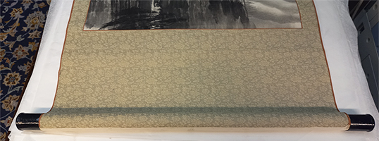 Sansui [Foggy mountain landscape]Antique hanging paper scroll. China. Heigth 58.0". Width 22.2" (ca. 147,3 x 56,3 cm). Wooden roller ends. Good condition.
