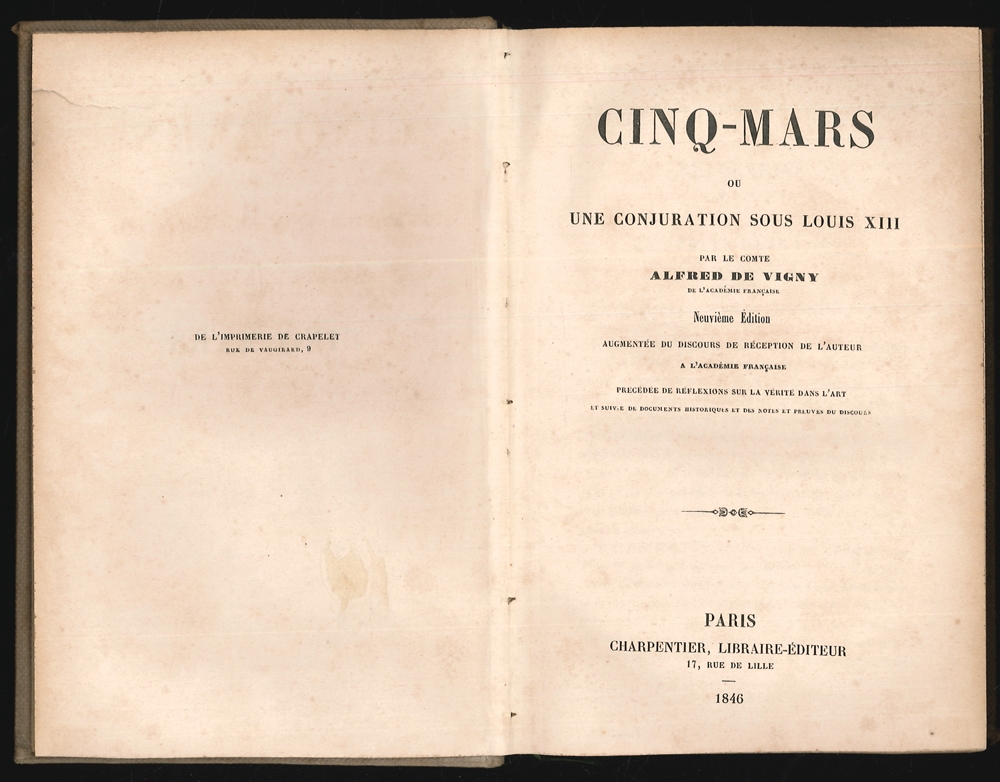 Cinq-Mars ou une conjuration sous Louis XIII. Neuvième Édition. Paris, Charpentier 1846. 8°. XI, 520 pp. Ln.-Bd. d. Zt. m. goldgeptägr. Rückentit. Wappen-Exlibris a. d. Vorderdeckel.