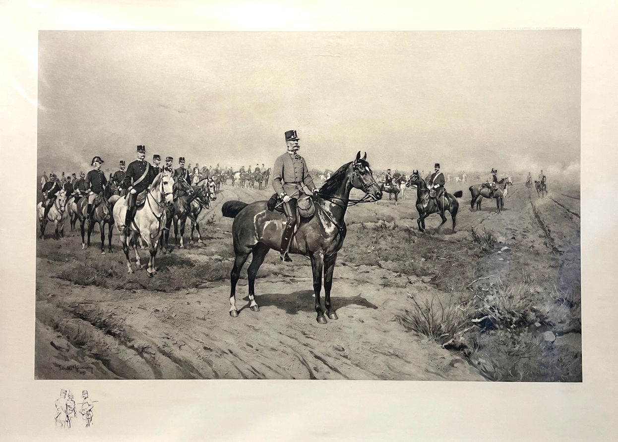 Kaiser Franz Joseph beim Manöver 1890/1891.Lithographie. [ca. 1892]. 41 x 63, 5 cm. (Bildgr.). Unter Passepartout.