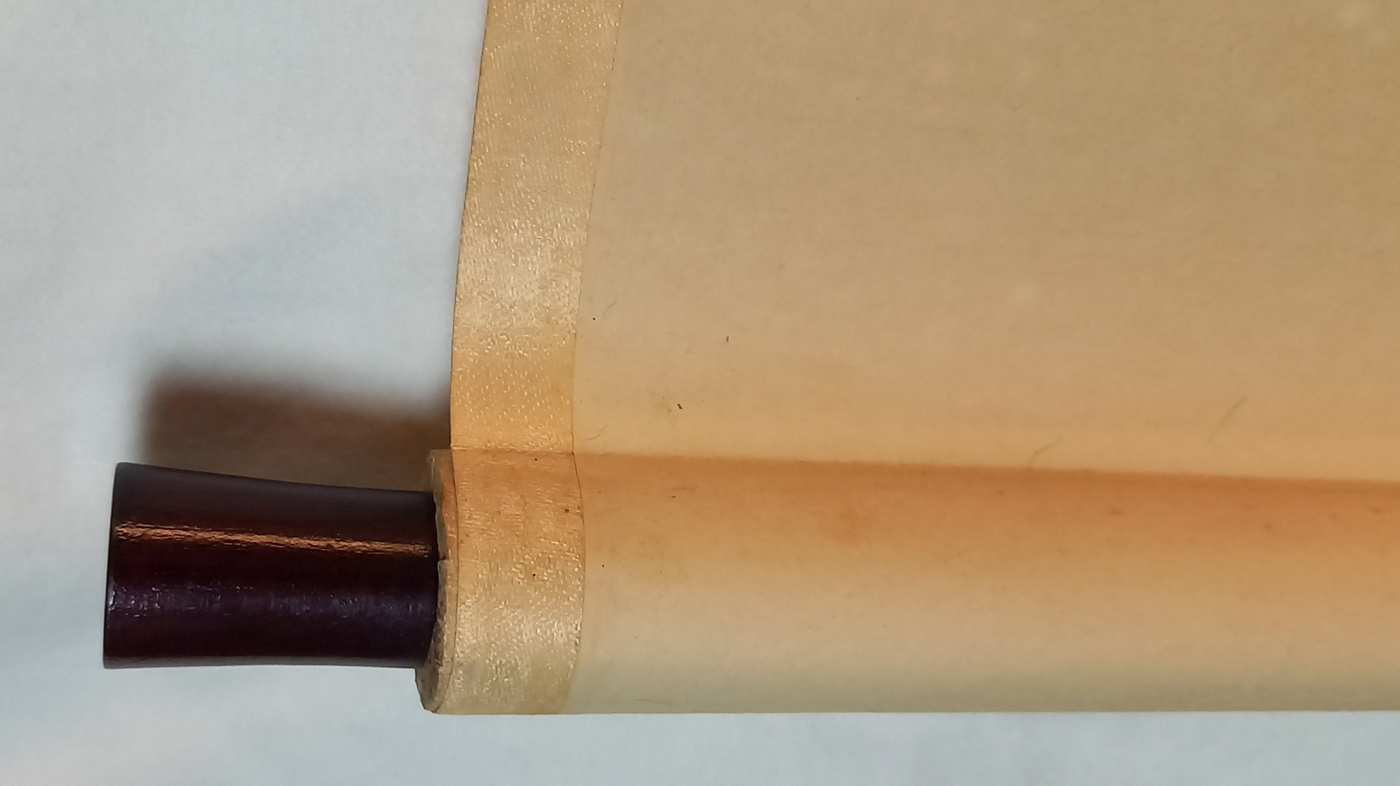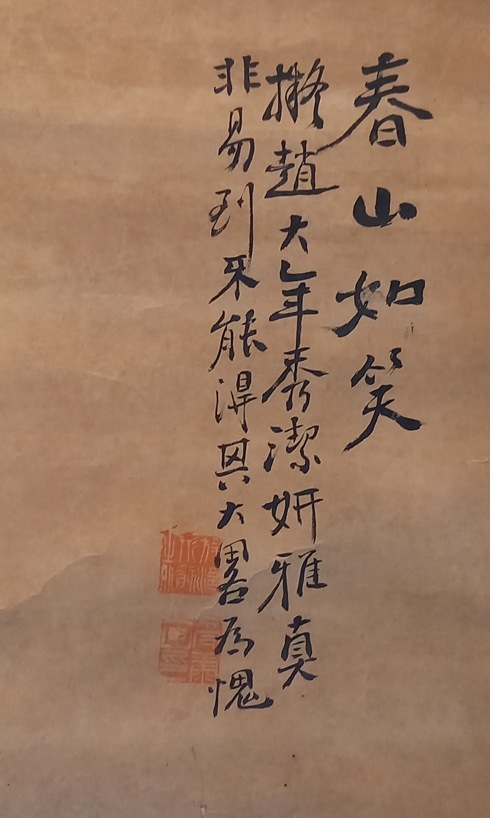 0189-26Sansui [Mountain landscape with blooming trees]. Antique hanging paper scroll. Bordered with small stripes of silk brocade. China. Heigth 72,5". Width 19,5" (ca. 184,2 x 49,5 cm). Wooden roller ends. Folding lines visible, rubbed, with water damages in the middle upper part. Chinese paper hanging scroll with mountain landscape. With an unknown signature seal. | |