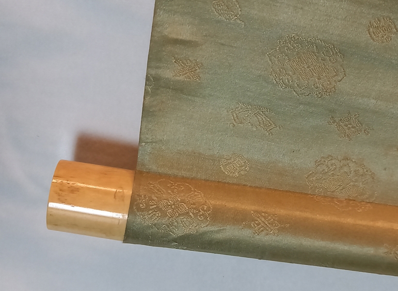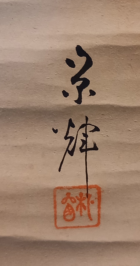 0191-26 MURATA, Eiki (born 1870) Boy and Tiger [in a Mirror?]. Japanese paper hanging scroll bordered with silk and silk brocade. With the seal of Eiki Murata, born 1870. The hanging scroll shows a boy who is a little frightend because he sees himself as a Tiger in a Mirror. | ||||