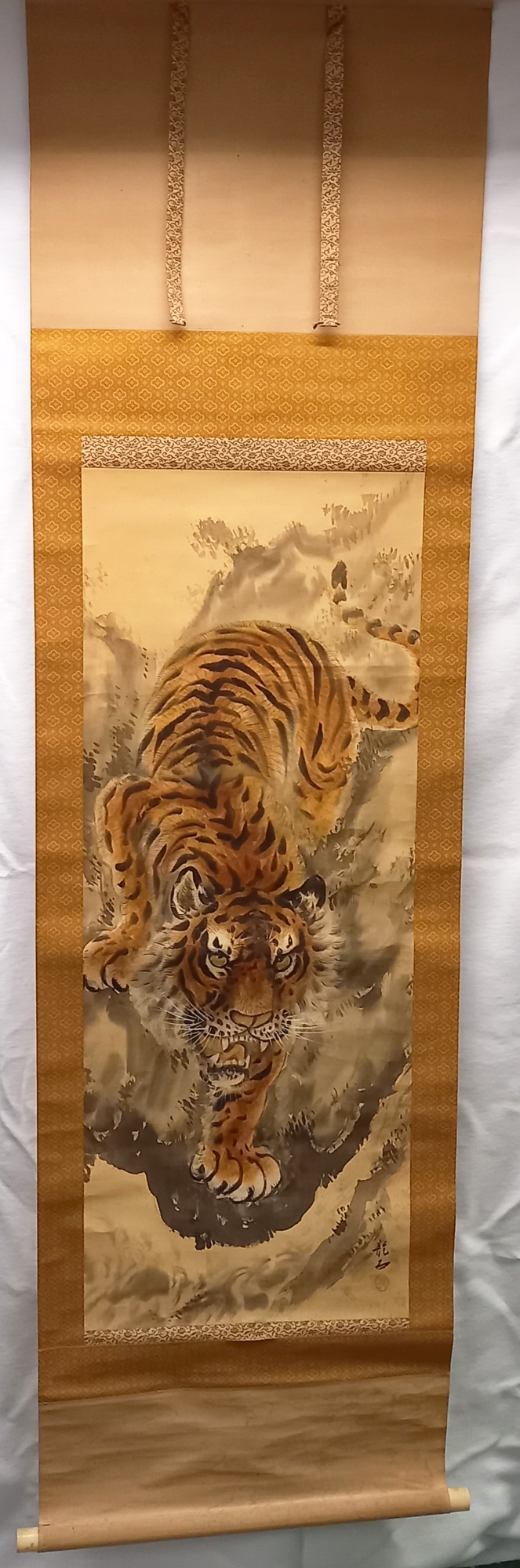 0192-26Tiger. Antique hanging paper scroll. Bordered with silk and silk brocade. Japan. Heigth 73,6". Width 20,5" (ca. 187 x 52,2 cm). Bone roller ends. Very good condition. Japanese paper hanging scroll bordered with silk and silk brocade, showing a Tiger in a landscape. With unknown seal. | |