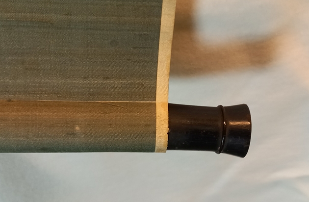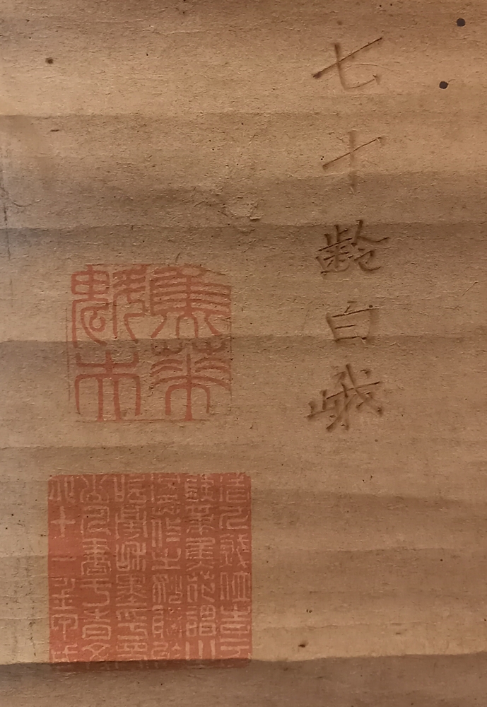 0193-26Dragon in Clouds. Antique hanging paper scroll. Bordered with silk and silk brocade. Japan. Heigth 63,9". Width 18,1" (ca. 162,5 x 46 cm). Wooden roller ends. Good Condition. Slightly rubbed. Japanese Kakejiku paper hanging scroll bordered with silk and silk brocade, showing a Dragon in clouds. With unknown seal. | |