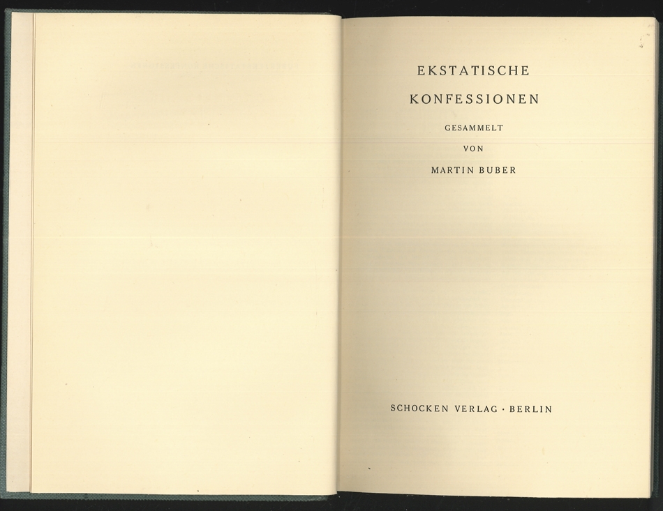 0200-26BUBER, Martin (Hrsg.). Ekstatische Konfessionen.Berlin, Schocken o. J. [1933]. gr.-8°. 203 (1) S. OLn. m. Rückensch.