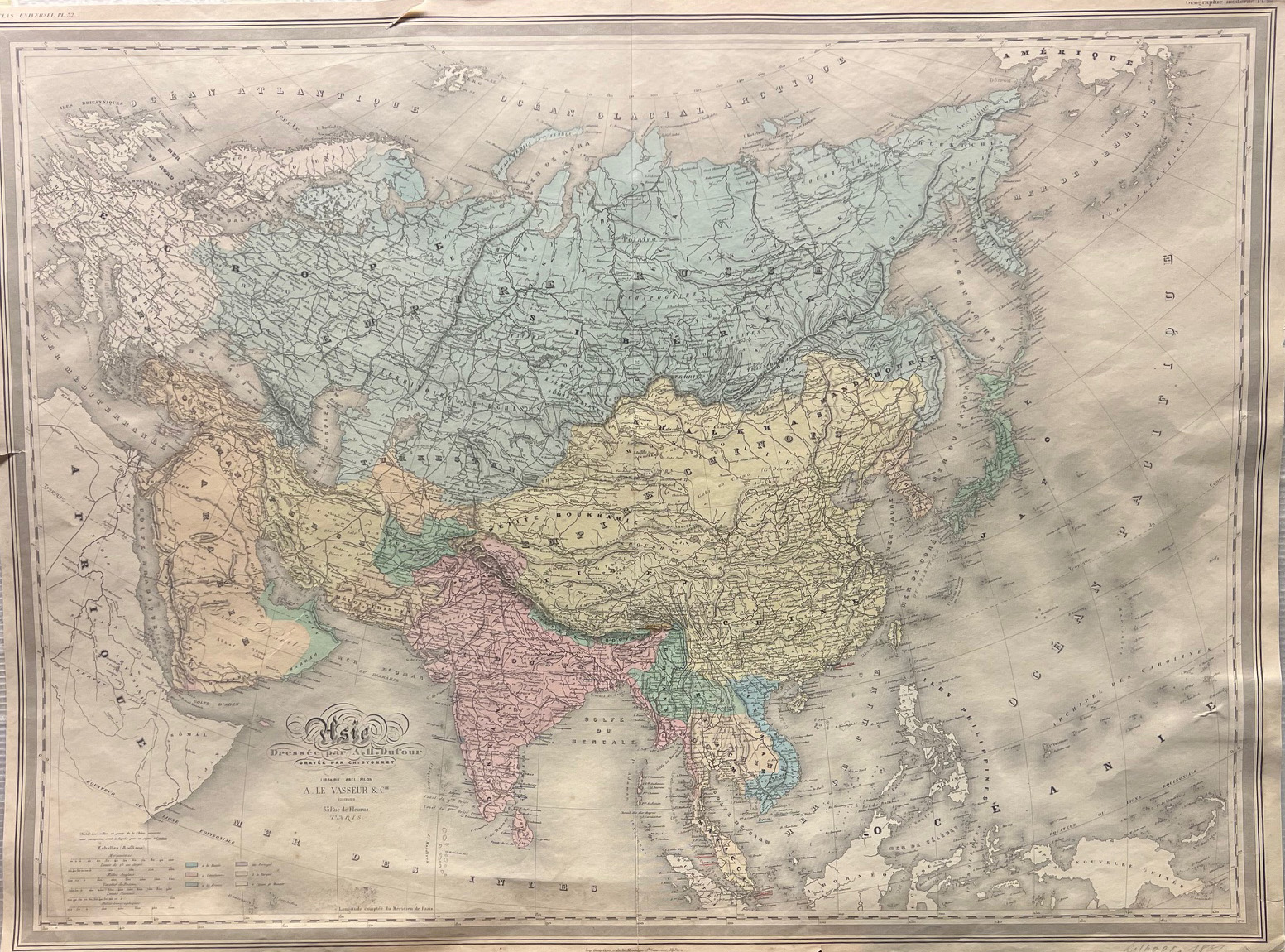 Asie. Dressée par A. H. Dufour. Gravée par Ch. Dyonnet. Asien. Kolorierter Stahlstich. Paris, A. Le Vasseur 1861. 56, 5 x 77 cm. (Bildgr. m. Bordüre). kl. Einriss auf der Oberkante.