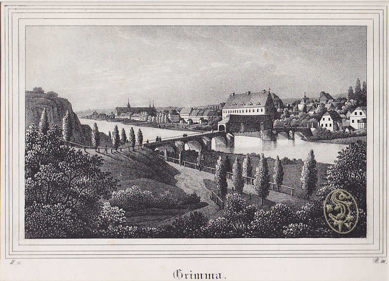 Grimma.Orig.-Lithographie aus "Saxonia" Bd. III [Dresden, Pietzsch & Comp. 1835]. 11,4 x 18,2 cm. (Bildausschn.); 18,5 x 27 cm. (Blattgr.) Unter Passepartout.
