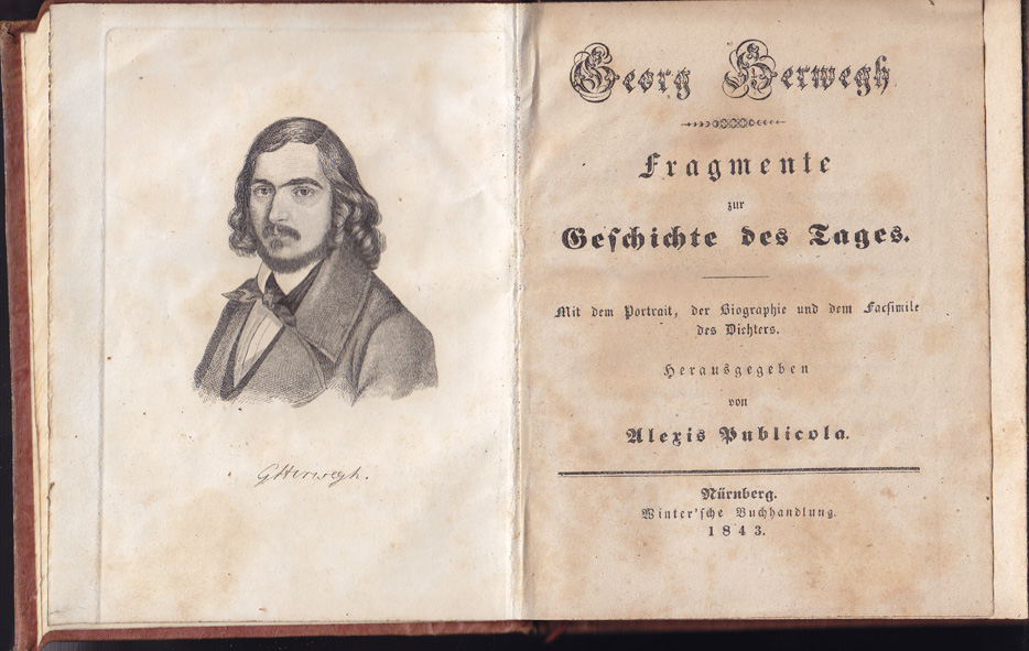 0288-02HERWEGH, Georg. Fragmente zur Geschichte des Tages. Hrsg. v. Alexis Publicola.Nürnberg, Winter 1843. 16°. 80 S. Mit gest. Titelportr. Ln. d. Zt. m. Rückengoldpräg. Bll. vereinz.stockfleckig. EA.Weller, Psd. 462 -