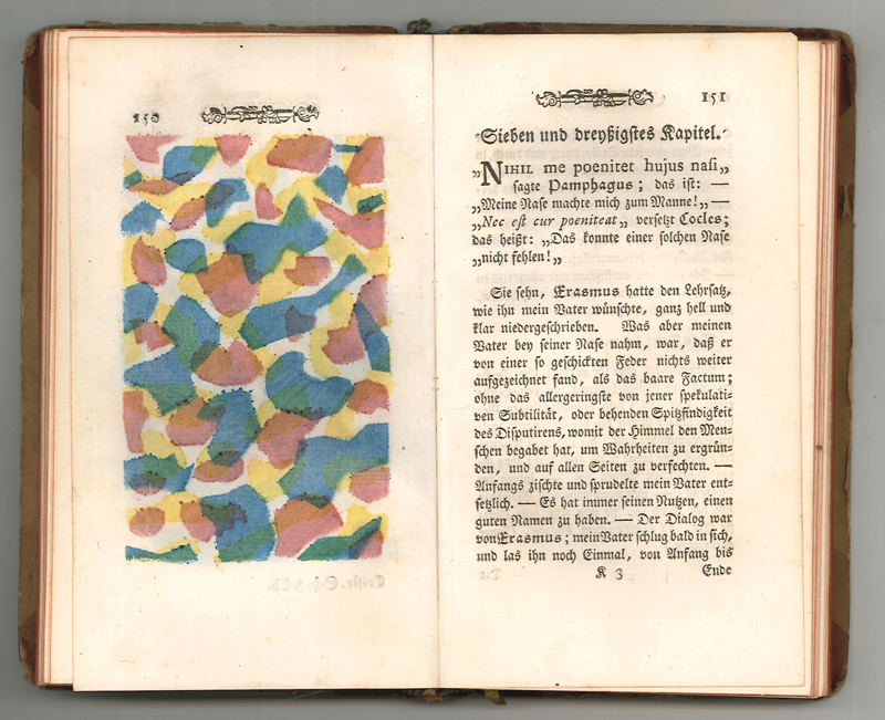 0308-25 [STERNE, Laurence] - [BODE, Johann Joachim Christoph]. Tristram Schandis Leben und Meynungen. Rosenberg/Hollein (Hrsg.). Turner, Hugo, Moreau. Entdeckung der Abstraktion. S. 278-290; Goedeke IV, 1, 586, 12; vgl. Slg. Borst 133 - Zweite Ausgabe von Johann Joachim Christoph Bodes (1730-1793) berühmter Übersetzung von Laurence Sternes (1713-1768) "Tristram Shandy". Sprachlich wie auch druckgraphisch steht die hier vorliegende Übersetzung von Bode klar vor der bereits ab 1761 durch Gottlieb August Langen veranlassten Ausgabe. Die sogenannte "black page" entspricht in Bodes Ausgabe weitgehend der Englischen, sie ist unregelmäßig schwarz gedruckt. Die berühmte "marbled page", die in den frühen englischen Ausgaben tatsächlich mit der Marmoriertechnik gestaltet wurde (für die erste Englische Werkausgabe wurde ein Stück marmoriertes Papier eingeklebt), wurde von Bode durch einen 3-farbigen Schablonendruck (rot, gelb, blau) ersetzt. Sterne rezipiert auch die Linientheorie ("line of beauty") William Hogarths (1697-1764), indem er im Teil VI plötzlich 5 "erträglich gerade Linien" einfügt (S. 139/140). "Sterne, der sich des Witzes seiner unerwarteten Vorgehensweise bewusst ist, demonstriert, dass nicht nur Figuren und Bewegungen, sondern auch Romane auf Linien reduziert werden können." (Entdeckung der Abstraktion, S. 276). - Die beiden Frontispize stammen von Carl Leberecht Crusius (1740-1779) nach William Hogarth (1697-1764). Die 6 Kupfertafeln von Daniel Berger nach Daniel Chodowiecki. | ||||||||