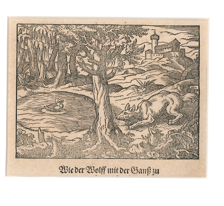 Wie der Wolff mit der Ganß zu fangen ist. Holzschnitt mit typographischem Text. [Frankfurt am Main, 1582]. 8, 5 x 11, 5 cm (Darstellungsgr.); 17 x 13, 7 cm (Blattgr.). Unter Passepartout. Etwas gebräunt.