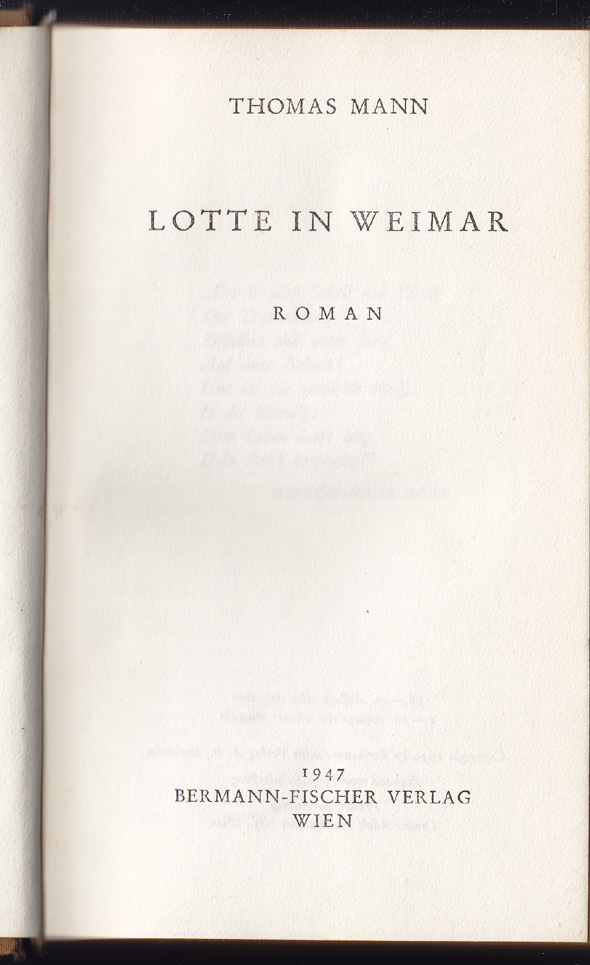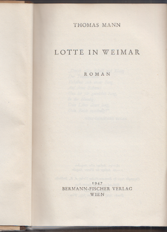 0414-08MANN, Thomas. Lotte in Weimar. 18.-27. Auflage aller Ausgaben. 1.-10. Auflage der Wiener Ausgabe. Wien, Bermann-Fischer 1947. 450 S. OHLn. Exlibris. Vord. Innengelenk verstärkt. (Stockholmer Gesamtausgabe der Werke von Thomas Mann. Wiener Ausgabe.) | |