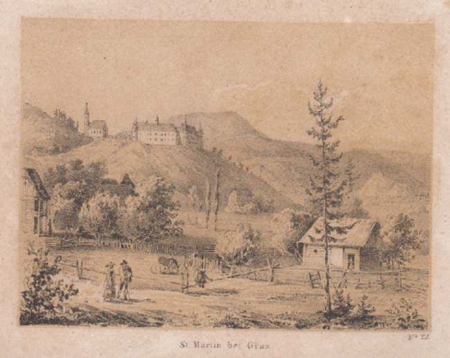 St. Martin bei Graz. XVI.Orig.-Tonlithographie. [Graz, Kaiser 1839-1858]. 11, 7 x 14, 6 cm. (Blattgr.); 8, 3 x 11, 2 cm. (Bildgr.)