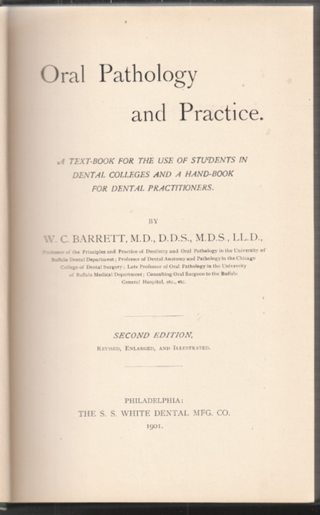 Oral Pathology and Practice. A Text-Book for the Use of Students in Dental Colleges and a Hand-Book for Dental Practitioners. 2. erw. u. illustr. Aufl. Philadelphia, White Dental 1901. gr.-8°. XII, 319 S. Mit 100 Abb. im Text. OLn. Mit Rückengoldpräg.