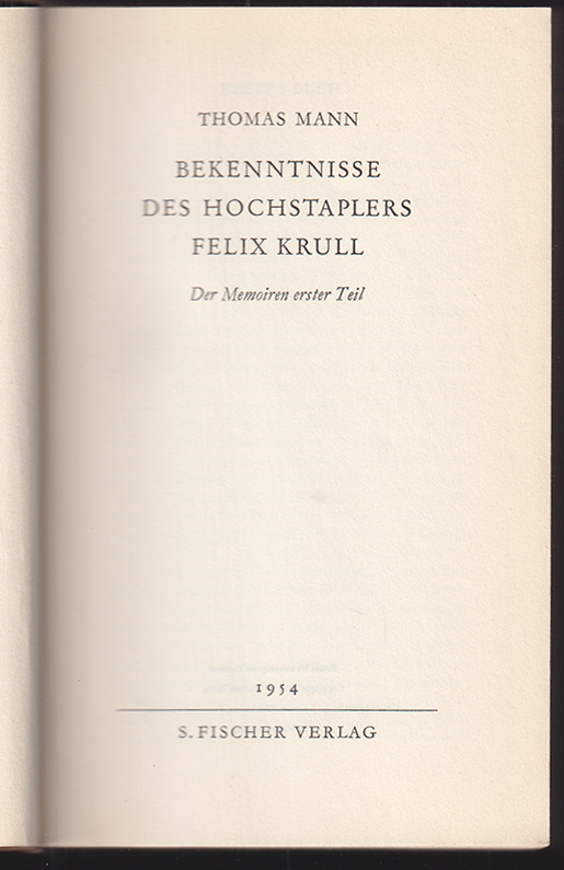 0611-00 MANN, Thomas. Bekenntnisse des Hochstaplers Felix Krull. Der Memoiren erster Teil. (Alles). Bürgin I, 99A; KLL 1430; Potempa D 12, 3.2 - Erstausgabe d. erw. endgültigen Fassung, unmittelbar nach d. aus urheberrechtlichen Gründen in den USA erschienenen hektograph. Volksausg. veröffentlicht | |||