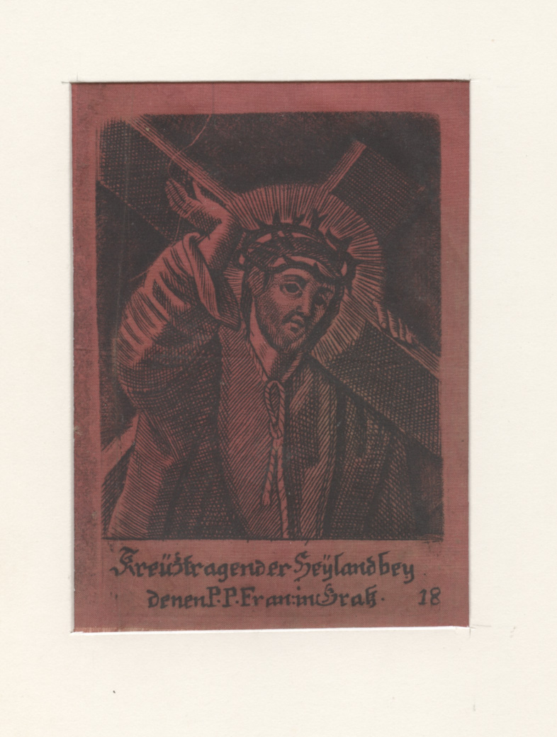 Kreuztragender Heyland bey denen P. P. Fran: in Gratz. Kupferstich auf roter Seide o. O. [ca. 1700]. 10 x 7, 5 cm. (Blattgr.).