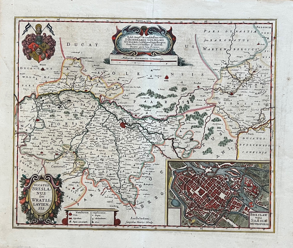 0858-17 BRESLAU - WECHNER, Georg - SCULTETUS, Jonas. Ducatus Breslanus sive Wratislaviensis. Nobil. Amplissimo & Consultissimo viro D. Bernhardo Gulielmo Nuslero, Celsissimo Lygio Bergensium Duci a Consilys ac secretis, Praecipuo operis huius Promotori. Links oben: Wappen. Links unten Kartusche. Rechts unten: Breslau aus der Vogelschau. | ||||
