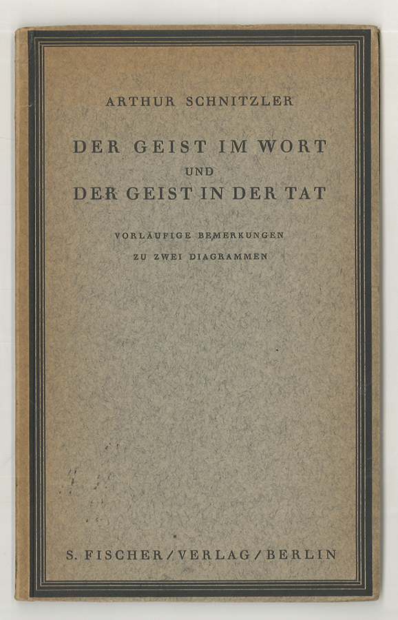 1069-25SCHNITZLER, Arthur. Der Geist im Wort und der Geist in der Tat. Vorläufige Bemerkungen zu zwei Diagrammen. Erste bis dritte Auflage. Berlin, S. Fischer (1927). 8°. 1 Bl., 59 (1) S., 2 Bll. mit 1 Diagramm-Falttafel mit 2 Diagrammen. Bedruckter OKart. Sehr gut erhalten. EA. W.-G.² 50 - Erstausgabe. | |