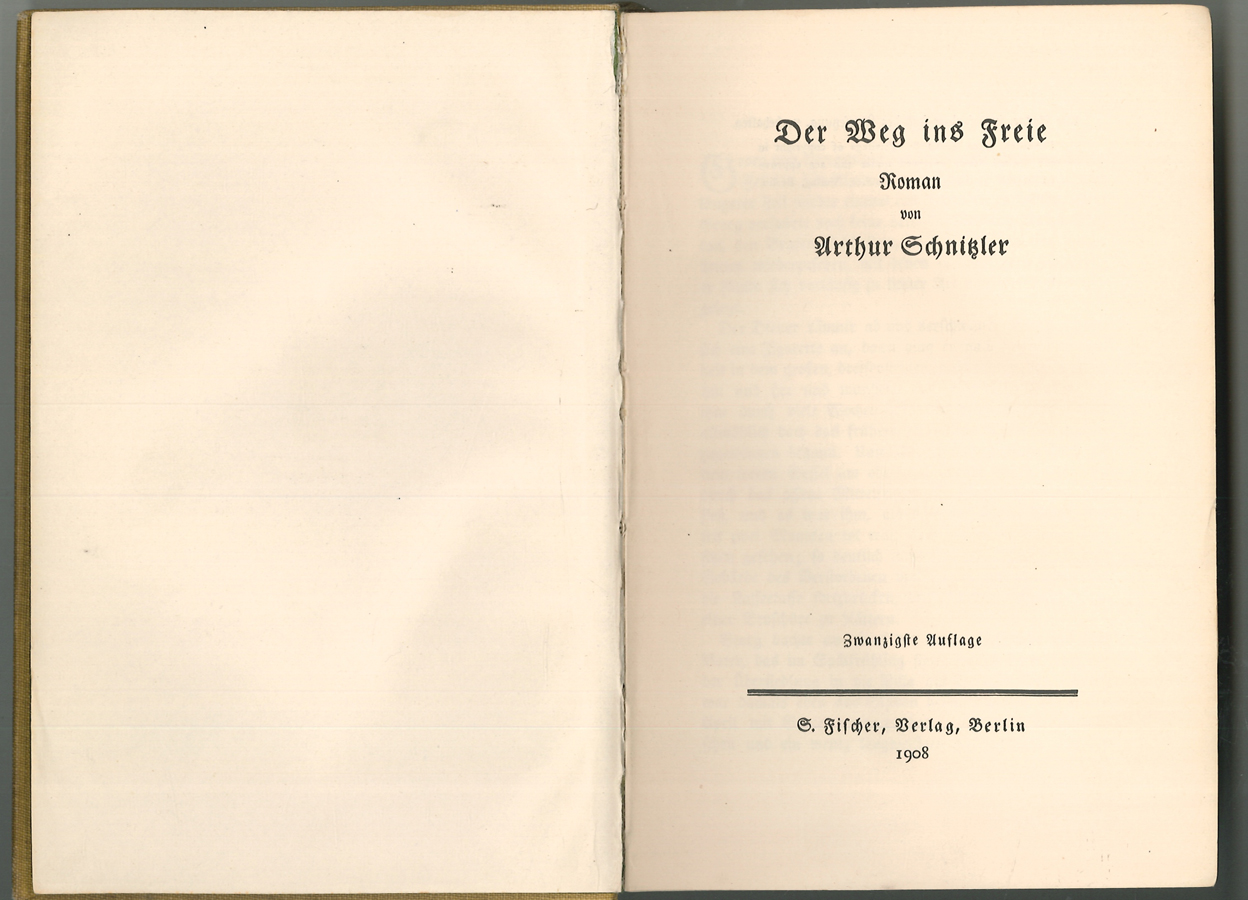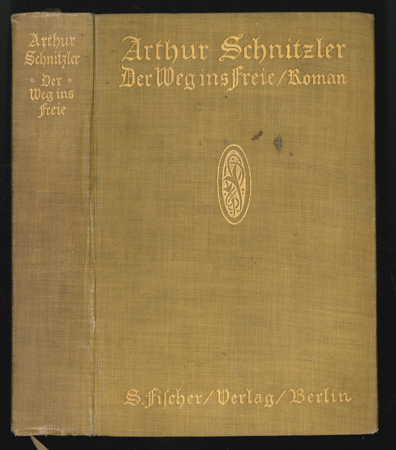 1131-25SCHNITZLER, Arthur. Der Weg ins Freie. Roman. Zwanzigste Auflage. Berlin, S. Fischer 1908. 8°. 1 Bl., 491 S., 2 Bll. OLn.-Bd. mit goldgeprägtem Deckel- u. Rückentitel. Kanten berieben, Ecken etwas bestoßen. Vorderes Gelenk leicht angeplatzt. vgl. W.-G.² 21 - Erschien im Jahr der Erstausgabe. | |