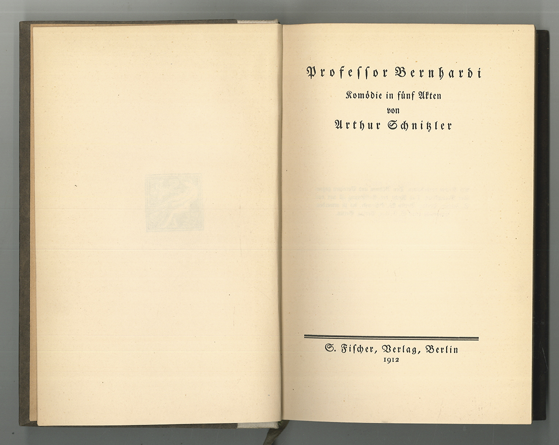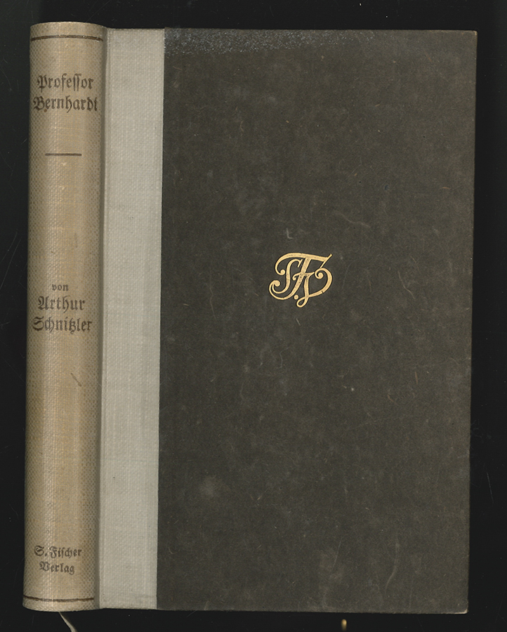 1133-25SCHNITZLER, Arthur. Professor Bernhardi. Komödie in fünf Akten. Berlin, S. Fischer 1912. 8°. 2 Bll., 255 (1) S. OHLn.-Bd. mit Rückentitel. Rücken etwas angegilbt, innen leicht gebräunt. Flieg. Bl. mit Exlibris "FM" im Stil der Wiener Werkstätte und Datum "28.XI.1912". EA. W.-G.² 28 - Erstausgabe von Arthur Schnitzlers (1862-1931) Werk. | |