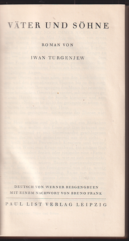 1195-25TURGENJEW, Iwan. Väter und Söhne. Roman. Übertsetzung aus dem Russischen von Werner Bergengruen. Mit einem Nachw. v. Bruno Frank. Lpz., P. List [ca. 1930]. 8°. 287 (5) S. auf Dünndruckpapier. OLdr.-Bd. Mit Goldpräg. u. Rückensch. Kanten schwach berieb. (Epikon. Romane der Weltliteratur). | |