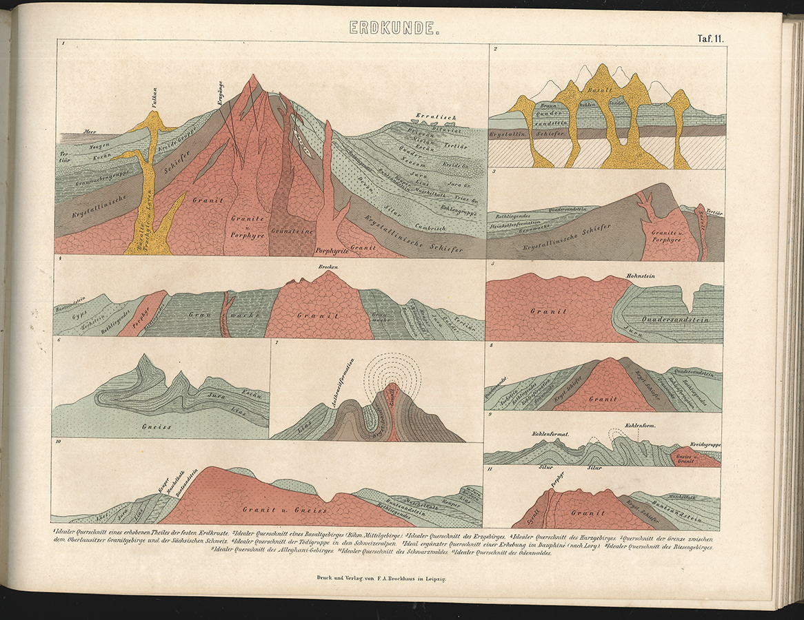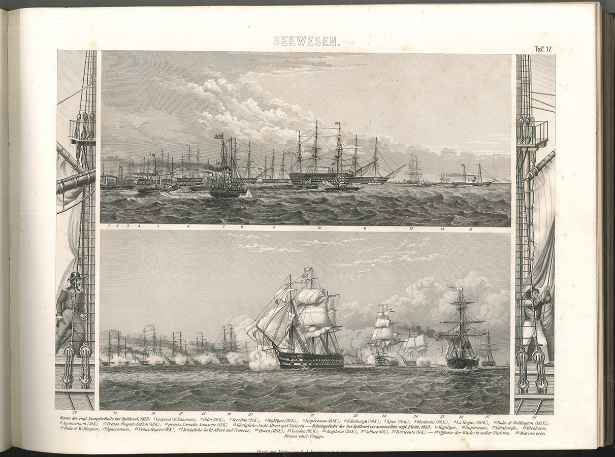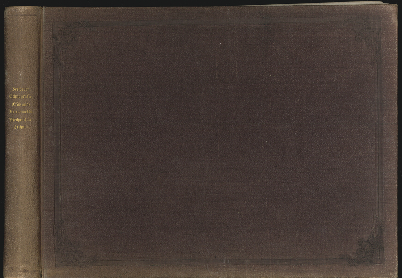 Seewesen-Ethnographie-Erdkunde-Kreigswese-Mechanische Technik. Leipzig, F. A. Brockhaus [um 1870]. Quer-4°. 144 Stahlstichtaf., davon 9 (teil-) koloriert. Ln.-Bd. d. Zeit mit goldgeprägtem Rückentitel. Berieben, unteres Gelenk etwas angeplatzt, Ecken ebstoßen. Tafeln teils gebräunt u. stockfleckig.