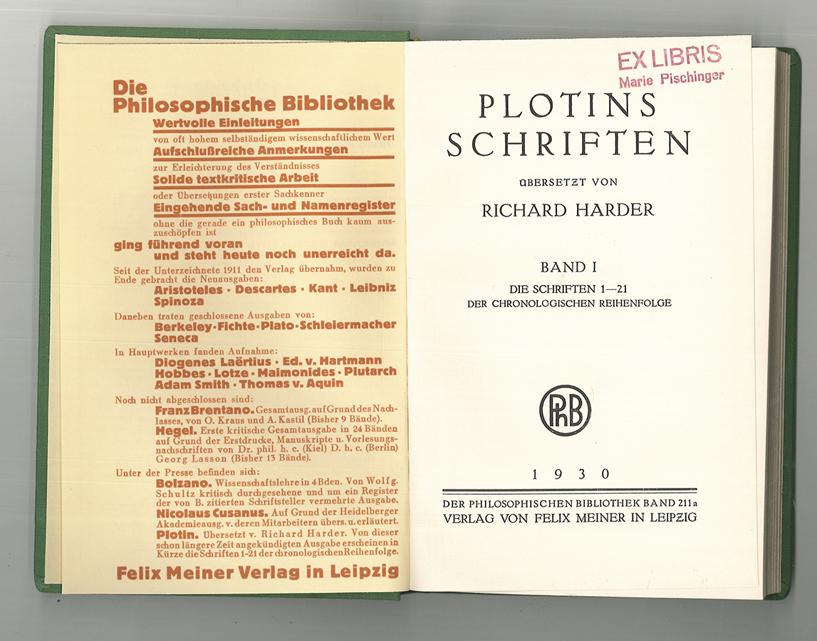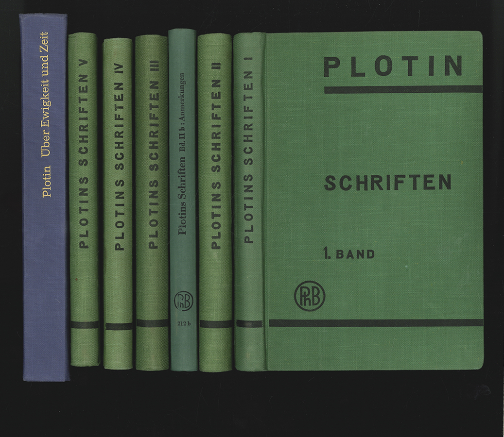1288-25 PLOTIN (Plotinus). Plotins Schriften. Übersetzt von Richard Harder. Erste umfangreiche Übersetzung der Werke Plotins (205-270 v. Chr.). Mit dem Ergänzungsband 2/b mit Anmerkungen. Die Ergänzungsbände "b" erschienen erst ab den 1960er Jahren. - BEILIEGEND: Werner BEIERWALTES, (Übers.)., Plotin. Über Ewigkeit und Zeit (Enneade III 7), Frankfurt, Vittorio Klostermann 1967. 8°. 319 S. | |||