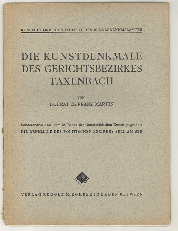 1350-25 TAXENBACH - MARTIN, Franz. Die Kunstdenkmale des Gerichtsbezirkes Taxenbach. Sonderabdruck aus dem 25. Bande der Österreichsichen Kunsttopographie "Die Denkmale des politischen Bezirkes Zell am See". Detailliertes Werk zu den Kunstdenkmälern des Bezirkes Taxenbach. | ||