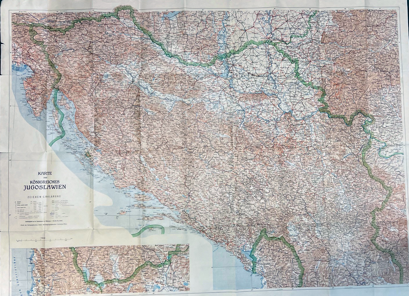 Übersichtskarte des jugoslawischen Reiches. Im Maße 1: 750. 000. Ausgeführt im Kartographischen, früher militär-geographischen Institut in Wien.Farb. Karte. Wien, R. Lechner [ca. 1925]. 84, 5 x 115 cm., Gefalt.