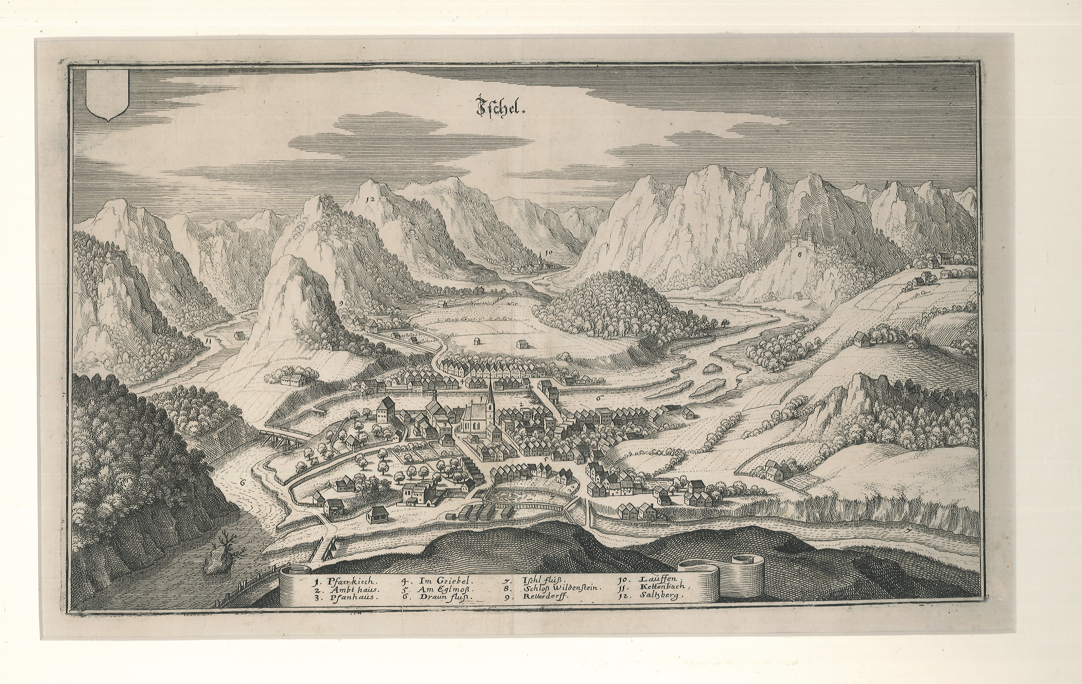 | 1423-25BAD ISCHL -  Ischel.Orig.-Kupferstich aus Merian. Frankfurt am Main, [1649]. ca. 20,8 x 33 cm. (Bildausschn.). Kräftiger Abdruck. Unter Passep. Minimale mittige Faltspur erkennbar. Sehr gut erhalten.