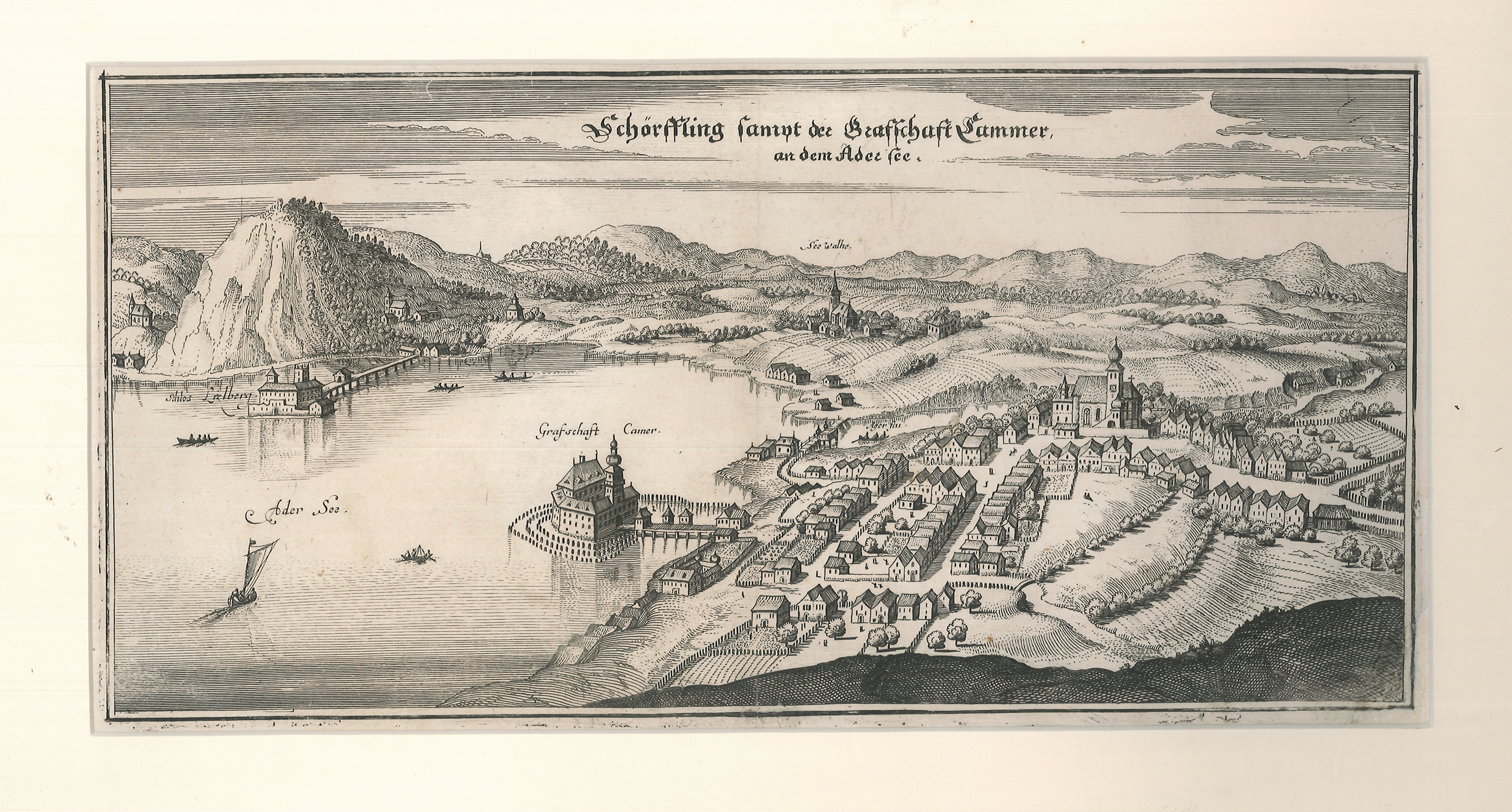 Schörffling sampt der Grafschaft Cammer an dem Adersee. Orig.-Kupferstich aus Merian. Frankfurt am Main [1649]. ca. 16 x 30,3 cm. (Bildausschn.). Kräftiger Abdruck. Unter Passep. Minimale mittige Faltspur erkennbar. Minimaler Braunfleck in der Darstellung.