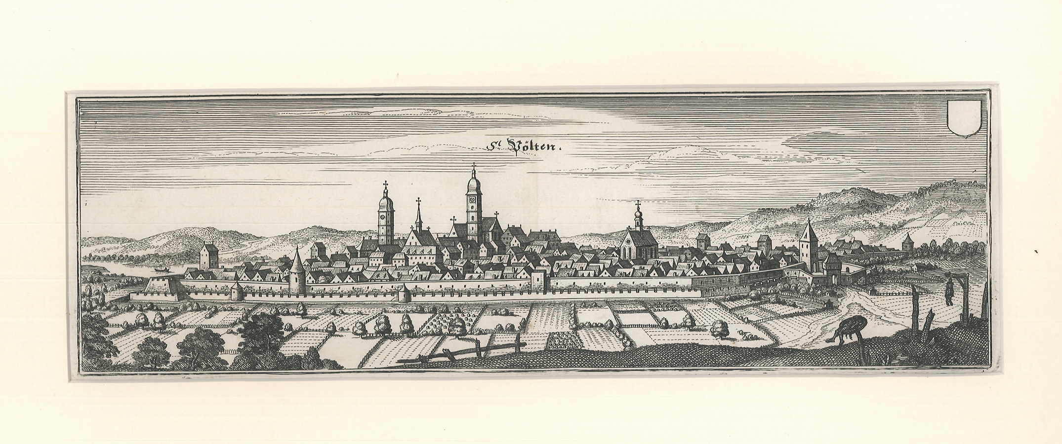 1430-25St. Pölten. Orig.-Kupferstich aus Merian. Frankfurt am Main [1649 ff,]. ca. 10,5 x 31,8 cm. (Bildausschn.). Kräftiger Abdruck. Unter Passep. Minimale mittige Faltspur erkennbar. Nebehay-W. 407, 23b - Mit Galgen im Vordergrund. Kupferstich aus Matth. Merians "Topographia Provinciarum Austriacarum". | |