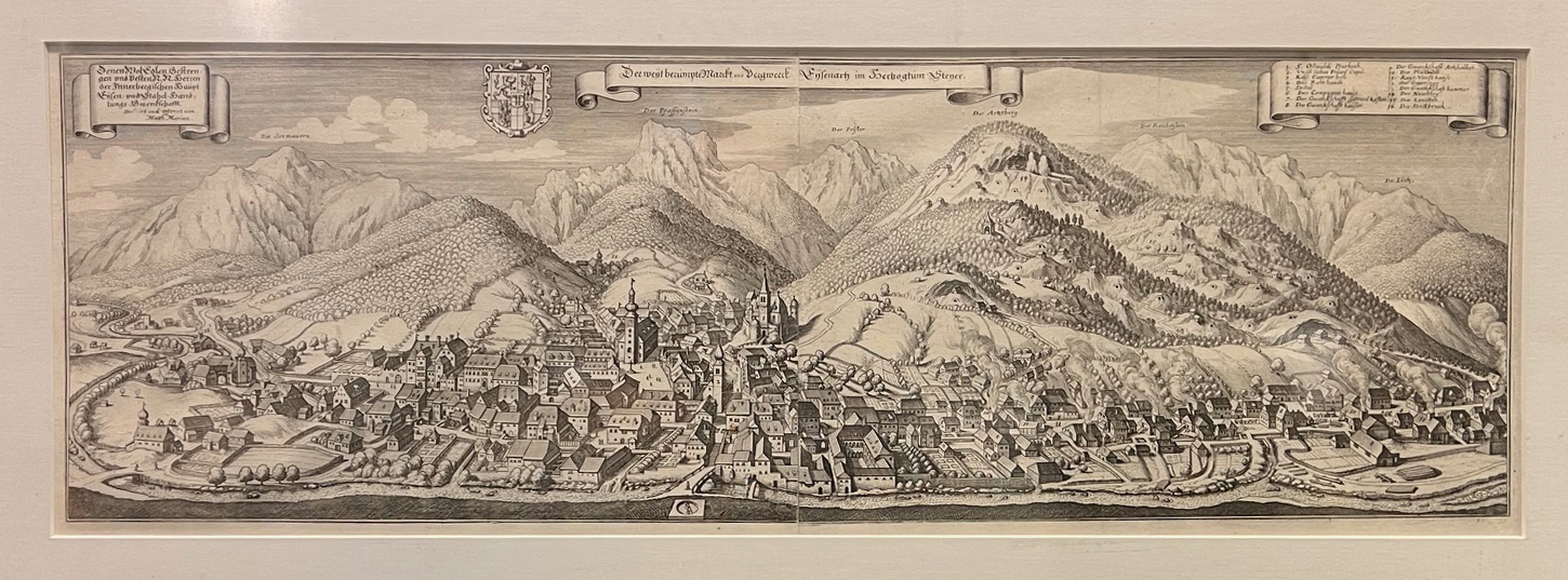 Der weyt berümpte Marckt und Bergwerck Eysenartz im Hertzogtum Steyer. Orig.-Kupferstich von 2 Platten aus Merian. Frankfurt am Main [1649 ff.]. ca. 23,5 x 71 cm. (Bildausschn.). Kräftiger Abdruck. Unter Passep. Minimale mittige Faltspur erkennbar.