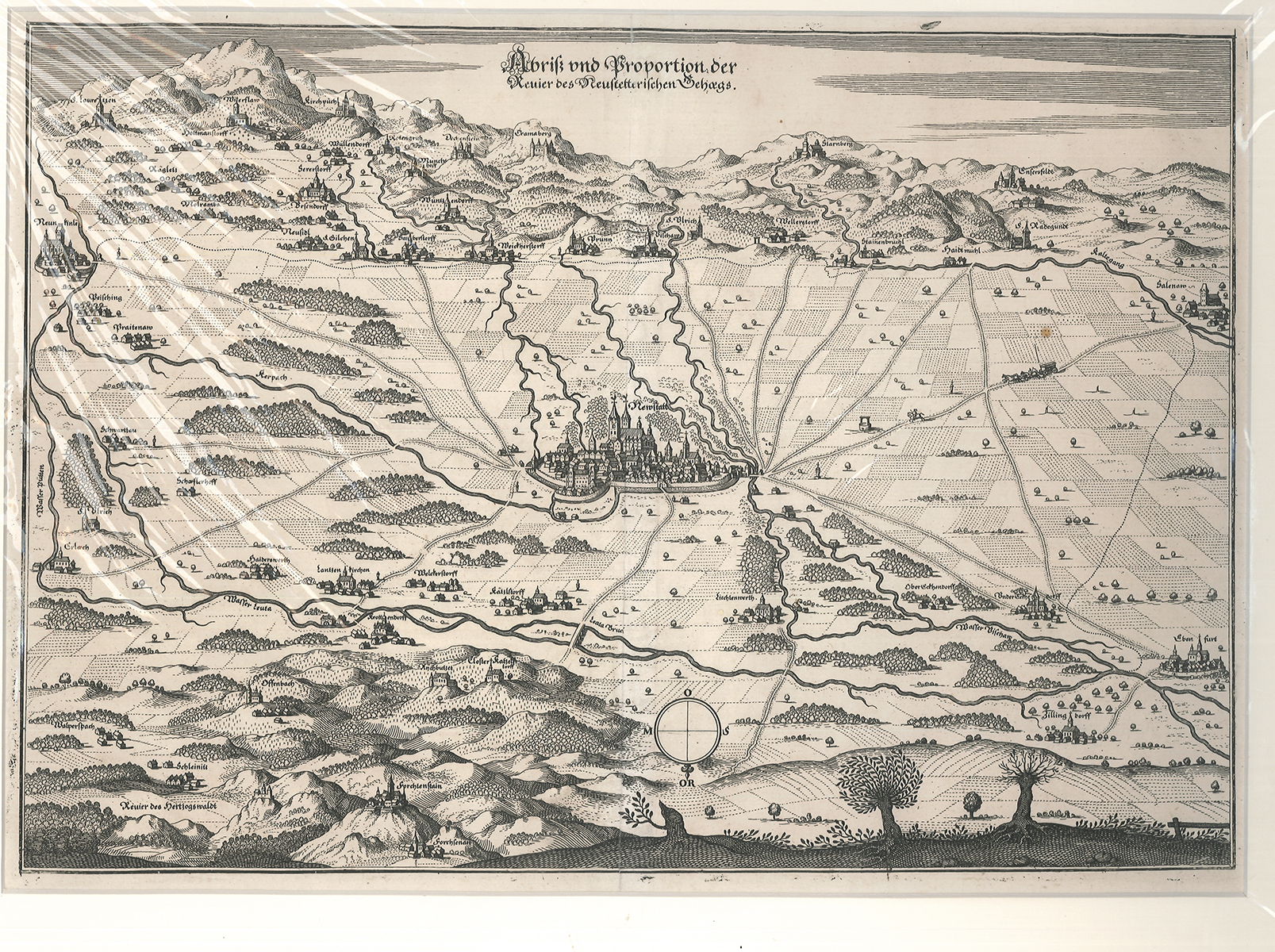 1482-25 WIENER NEUSTADT - Abriß und Proportion der Revier des Neustetterischen Gehaegs Nebehay-W. 407, 22 - Im Vordergrund ist das "Revier des Hertzogswaldt" und die Burg Forchtenstein zu sehen. Kupferstich aus Matth. Merians "Topographia Provinciarum Austriacarum". | ||