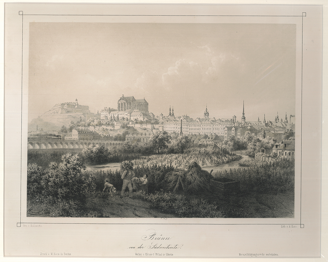 Brünn von der Südwestseite.Getönte Lithographie. Olmütz, Eduard Hölzel [1857]. 25 x 31 cm (Bildausschnitt). Unter Passepartout. Sehr gut erhalten.