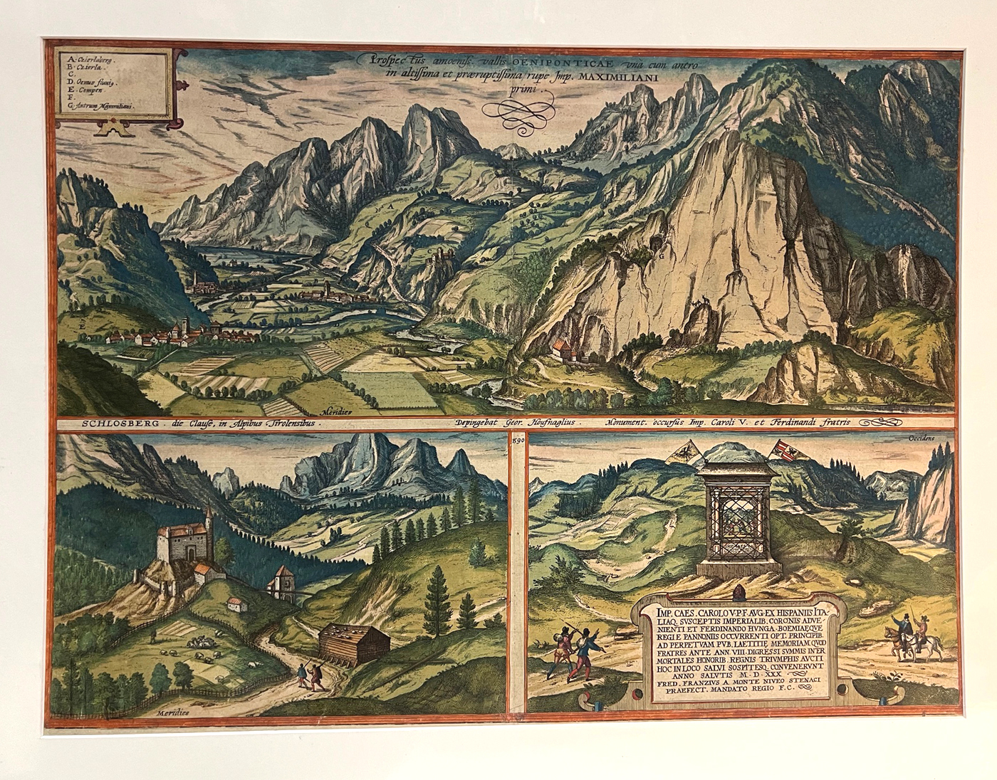 1495-25 INNTAL - HOUFNAGEL, Geor[g], (auch: HOEFNAGEL). Prospectus amoeniss. vallis Oeniponticae una cum. antro in altissima et praeruptissima rupe Imp. Maximiliani primi. Koeman II B & H 5 no. 59.; Fauser 15924; Nebehay-Wagner108, 59 - Ansicht vom Inntal mit Zirl, Kematen und Martinswand, Klause und Schloßberg bei Reutte sowie einem Monument für Karl V. in Steinach am Brenner. Georg Hoefnagel (1542-1600) schuf diese Ansicht für den fünften Band der monumentalen Werkes "Civitates Orbis Terrarum", das zwischen 1593 und 1618 in Köln erschien. In der Platte signiert und dat. "1590". Verso mit deutschem Text, also aus der deutschen Ausgabe "Contrafactur und Beschreibung von den vornembsten Staetten der Welt, das Fünffte Buch". | ||
