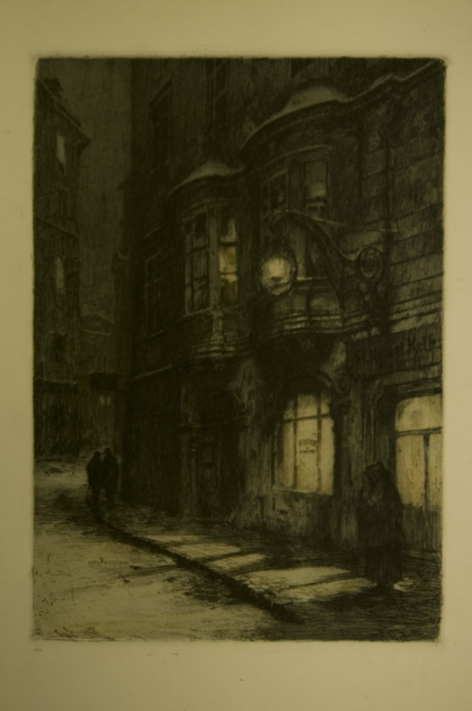 1504-25 WIEN - KASIMIR, Luigi. Graphiker (1881-1962). [Wien. Weinstube St. Urbanikeller, Am Hof]. vgl. Thieme-B. XIX, 582f.; Antiquitäten-Rundschau 23. Jg. 1925, Nr. 24; Schüttler, Wien 1944 - Von Kasimir eigenhändig signiert/Signed by Kasimir. Num. "92". Zu sehen ist die Wiener Weinstube Urbanikeller, die 1906 eröffnet wurde. | |||