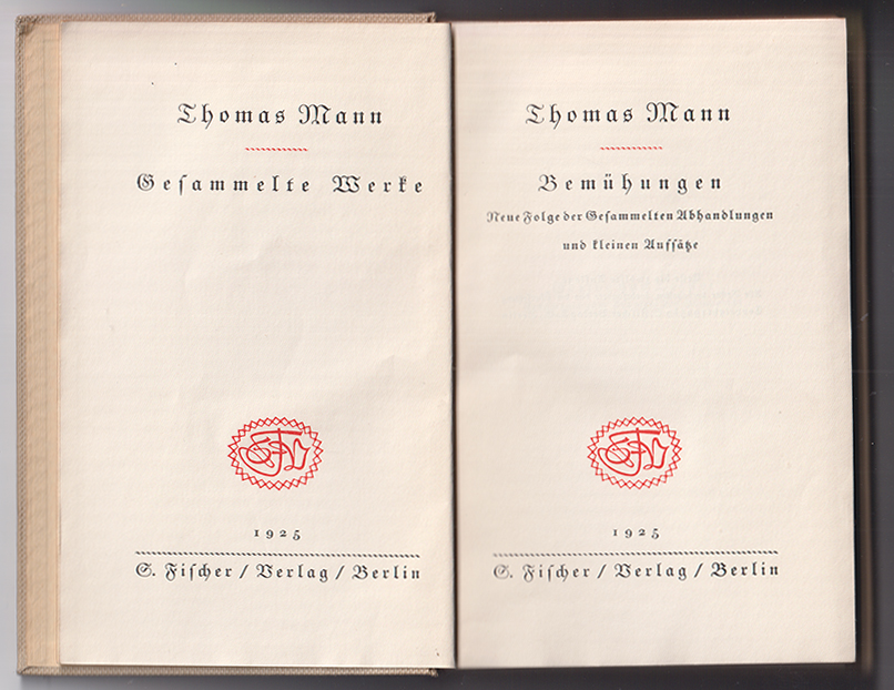 1509-01MANN, Thomas. Bemühungen. Neue Folge der Gesammelten Abhandlungen und kleinen Aufsätze.Bln., S. Fischer 1925. 339 (4) S. OLn. (Gesammelte Werke) W.-G.² 29; Bürgin I, 28 -
