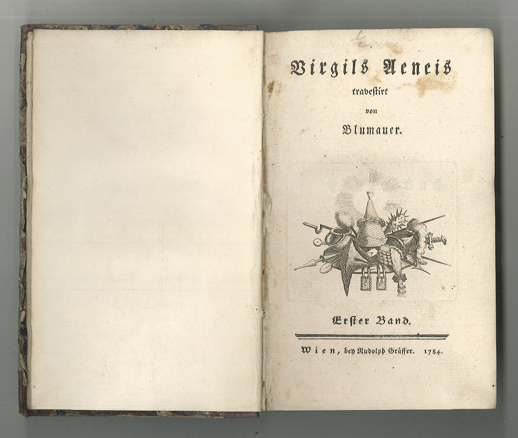 1592-25 BLUMAUER, [Alois]. Virgils Aeneis travestirt. Erstausgabe. Die ersten beiden Bände von Alois/Aloys Blumauers (175-1798) Werk "Virgils Aeneis travestirt". Die gestochene Vignette des 2. Bandes stammt von Jakob Adam. Ein Bleistifteintrag am Spiegel schreibt das gestochene Exlibris "Fischer" dem Hof-Kupferstecher Josef Fischer (1769-1822) zu. | ||||