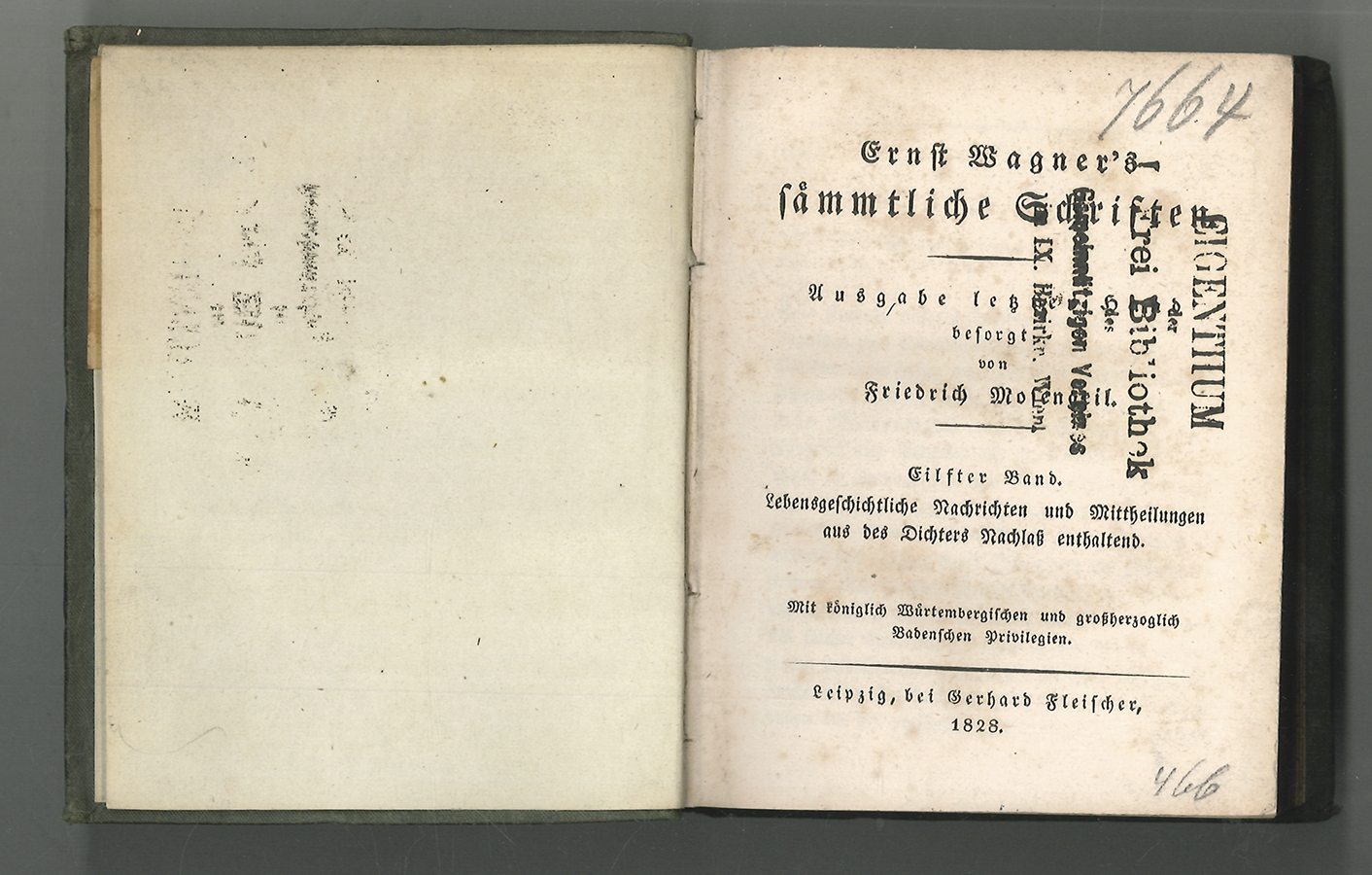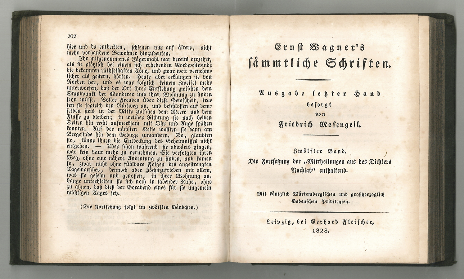 1596-25 WAGNER, [Johann] Ernst. Ernst Wagner's sämmtliche Schriften. Ausgabe letzter Hand besorgt von Friedrich MOSENGEIL. Bände 11 und 12 der Werkausgabe von Johann Ernst Wagners Schriften (1769-1812). Diese beiden Bände umfassen einen Biographie Wagners, basierend auf Briefen zwischen Wagner und seinem Freund und Herausgeber Friedrich Mosengeil (1773-1839). Aus einer ehemaligen Wiener Leibibliothek: "Der Ersten öffentlichen Frei Bibliothek und Frei Lese Halles des Gemeinnützigen Vereines im IX. Gemeinde Bezirke (Alsergrund) der Stadt Wien als Geschenk". | ||||