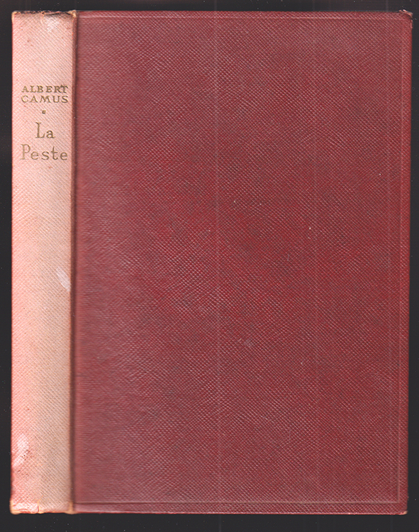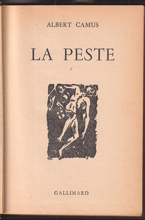 La peste.[Paris], Gallimard (1947). kl.-8°. 255 S. Mit Titelvign. u. 1 Textill. OLn. Rücken gebleicht.