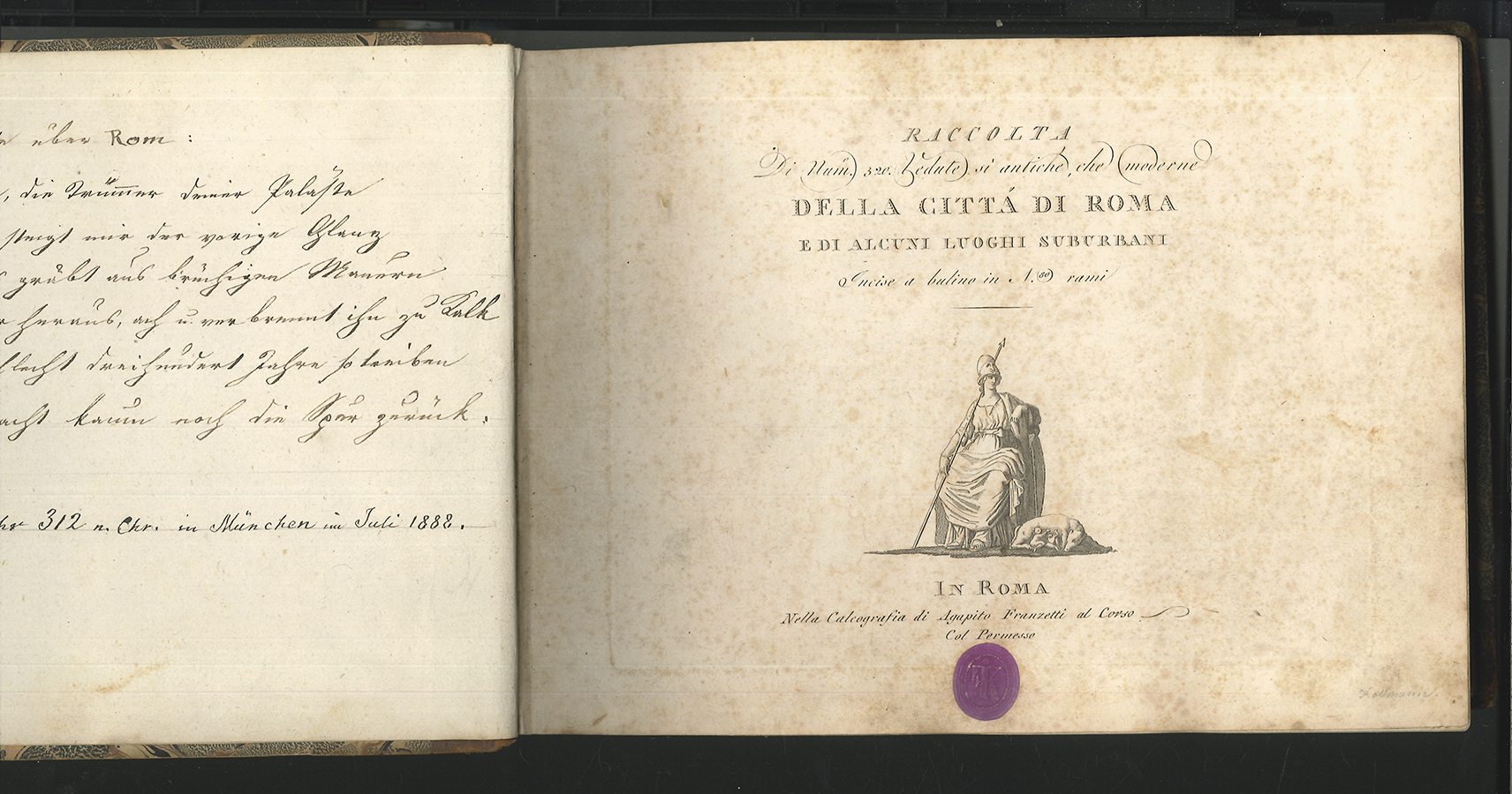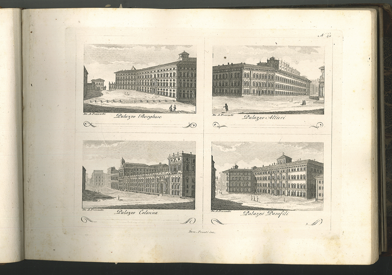1653-25 ROMA - Raccolta di Num. deg 320 Vedute si antiche, che moderne della citta di Roma e di alcuni luoghi suburbani Incise a bulino in N.deg 80 rami. Umfangreiches Werk mit 320 Ansichten von Roms antiken und neueren Sehenswürdigkeiten auf 80 Tafeln. Die Tafeln stammen u. a. von Giovanni Battista Cipriani , Francesco Morelli und Antonio Giuseppe Barbazza. Aus dem Besitz des Augsburger Stadtbaurates Franz Joseph Kollmann (1800-1894), mit dessen Notizen, teils auf den Versoseiten der Tafeln oder auch zu Beginn und am Schluss im Register. | ||||||