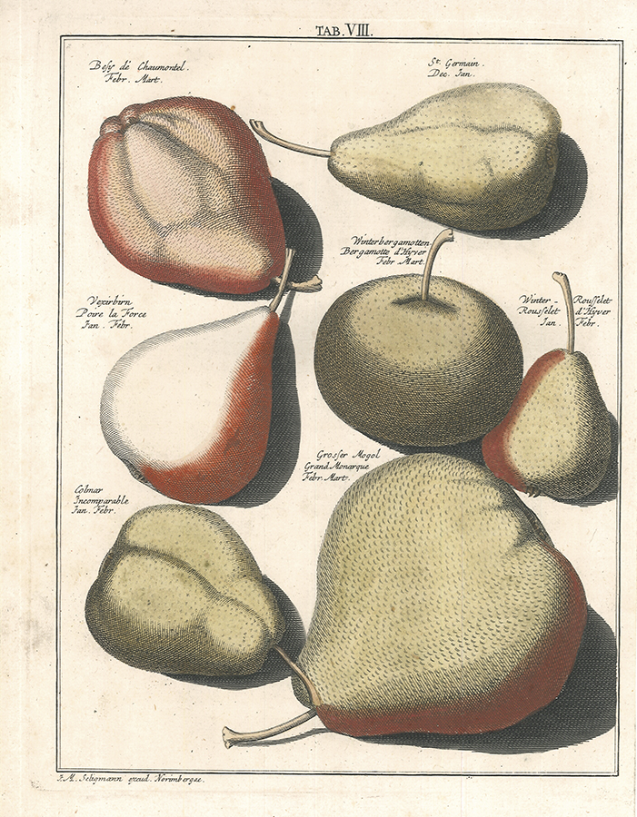 1695-25 SELIGMANN, J[ohann] M[ichael]. - [Birnensorten] Tab. VIII. Besy de Chaumontel Febr. Mart., St. Germain Dec. Jan., Winterbergamotten [...]. Zu sehen sind u. a. folgende Sorten: "Colmar", "Grosser Mogol", "Vexirbirn" oder auch "Winter-Pousselet". Aus: Johann Hermann Knoop/Georg Leonhard Huth (Übers.), Pomologia, das ist Beschreibungen und Abbildungen der besten Sorten der Aepfel und Birnen, welche in Holland, Deutschland, Franckreich, Engeland und anderwärts in Achtung stehen, und deswegen gebauet werden [...], Nürnberg 1760, Teil I. | ||