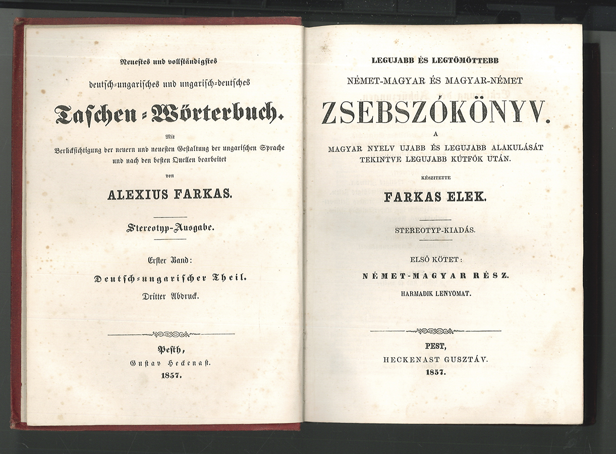 1707-25 FARKAS, Alexius/Elek. Neuestes und vollständigstes deutsch-ungarisches und ungarisch-deutsches Taschen-Wörterbuch. Mit Berücksichtigung der neuern und neuesten Gestaltung der ungarischen Sprache und nach den besten Quellen bearbeitet. Legujabb és legtömöttebb német-magyar es magyar-német Zsebszokönyv. A magyar nyelv ujabb és legujabb alakulását tekintve legujabb kútfök utá [...]. Deutsch-ungarisches/ungarisch-deutsches Wörterbuch von Alexius/Elek Farkas. Flieg. Blatt mit Vermerk: "Von Ihrer Majestät der Kasierin Carolina Augusta erhalten am 1. Jänner 1862. E. v. Paris". Karoline Charlotte Auguste von Bayern (1792-1873) heiratete 1816 Franz I. von Österreich und lebte nach seinem Tod 1835 als Kaiserinwitwe hauptsächlich in Salzburg. | |||||