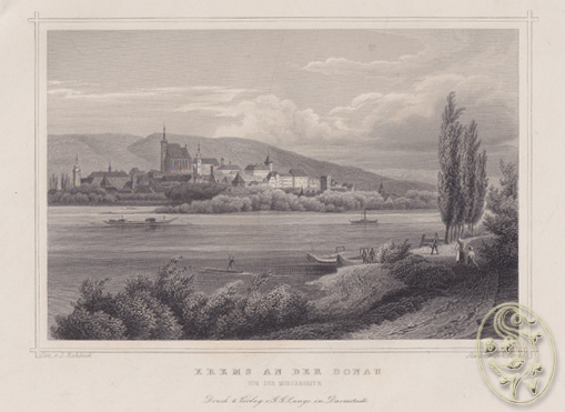 Krems an der Donau von der Morgenseite.Orig.-Stahlstich Darmstadt, Lange 1871. 11 x 16, 8 cm. (Bildausschn.).