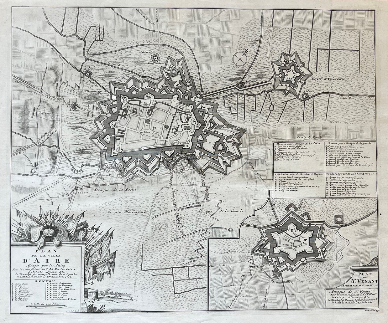 1725-01 AIRE - Plan de la Ville d'Aire. Assiegée par les Alliez Sous le Commandem.t de S.A.S. Monsr. le Prince d'Anhalt Dessau &tc. La Tranchée fut ouverte la nuit du 11. Septembre on battit la chamade le 8me Novembre 1710. Plan v. Aire und Umgebung bei Lille in Nordfrankreich, einem der Kriegsschauplätze des Spanischen Erbfolgekriegs (1701-1714).In der rechten unteren Ecke: "Plan de St. Venant. ca. 27 x 18 cm. Assiegé par les Allies en 1710. Attaque de St. Venant sous le Commendement de S.A.S. Monsr. le Prince d'Orange..." | ||