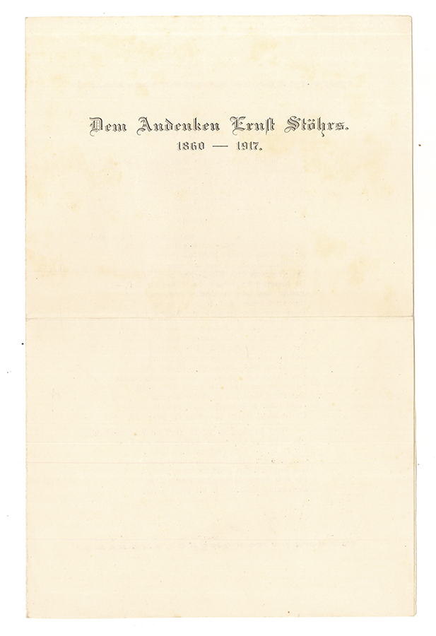 1745-25 STÖHR - F. F. Dem Andenken Ernst Stöhrs 1860-1917. Faltblatt mit Grabrede "An Ernst Stöhrs Grabe", Stöhr beging 1917 Suizid. Er war Gründungsmitglied der Wiener Secession. 1918 gab es eine Gedächtnisausstellung mit Stöhrs Werken. Im Oktober 1918 erfolgte dann die "Versteigerung des künstlerischen Nachlasses Ernst Stöhr" durch Wawra in Wien. | ||