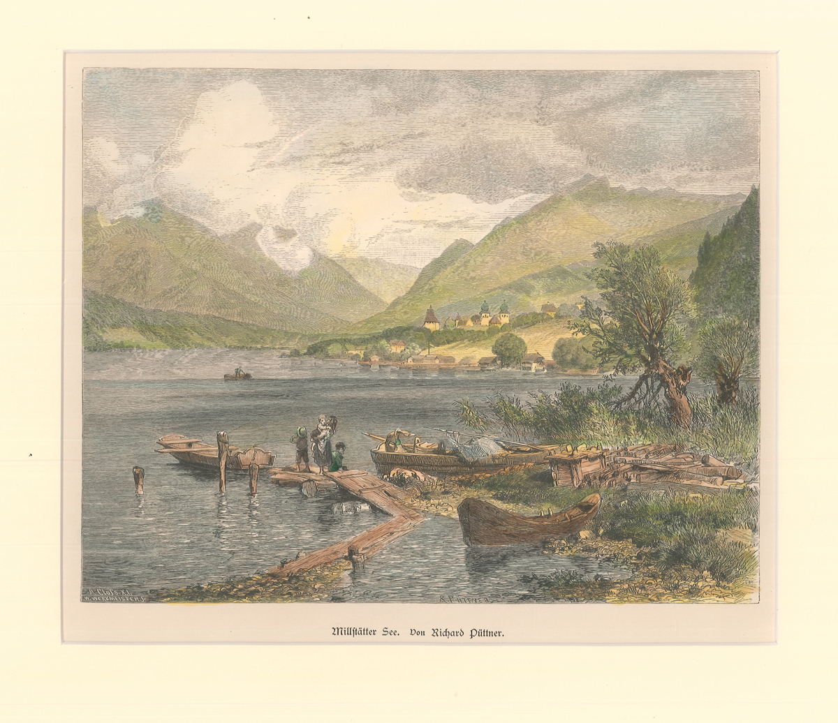 Millstätter See. Kolorierter Holzstich. Stuttgart, Gebr. Kröner [ca. 1880]. 19 x 24 cm. (Bildausschn.). Unter Passep. In sehr gutem Zustand.