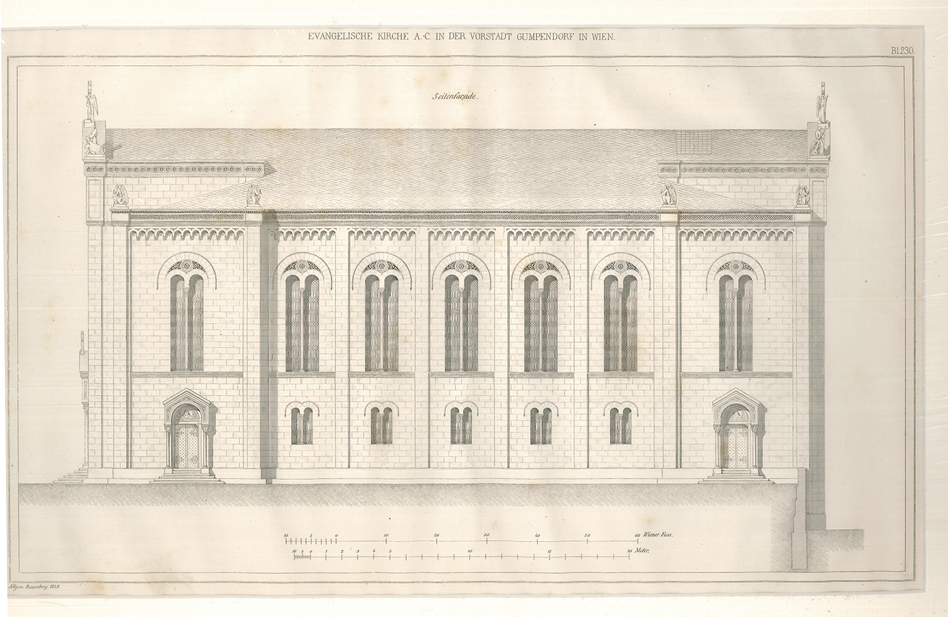 Nebehay-W. 872,14 - Seitenansicht der evangelischen "Gustav-Adolf-Kirche" in Wien. Aus: Allgemeine Bauzeitung, Jg. 14, Wien 1849.