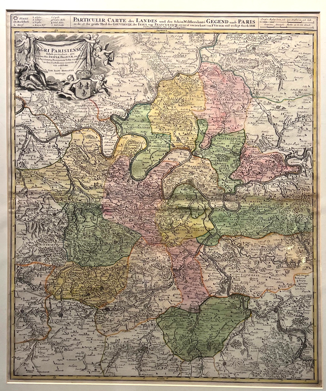1805-25 PARIS - HOMANN, Joh[ann] Bapt[ist]. Particulir Carte des Landes und der Schön-Weltberuhmte(n) Gegend umb Paris […] accurat verzeichent von F. VIUIER/ Agri Parisiensis Tabula particularis, qua maxima pars Insulae Franciae, seu Regiae in suas castellanias accurate divisa exhibetur. Sandler 59, 51 - Von Johann Baptist Homann (1664-1724) nach Francois de Viuier (gest. 1682) gestochene Karte von der Pariser Umgebung. Zeigt das Gebiet um Paris von Limay und Francourville bis Chantilly und Fontainebleau. | ||
