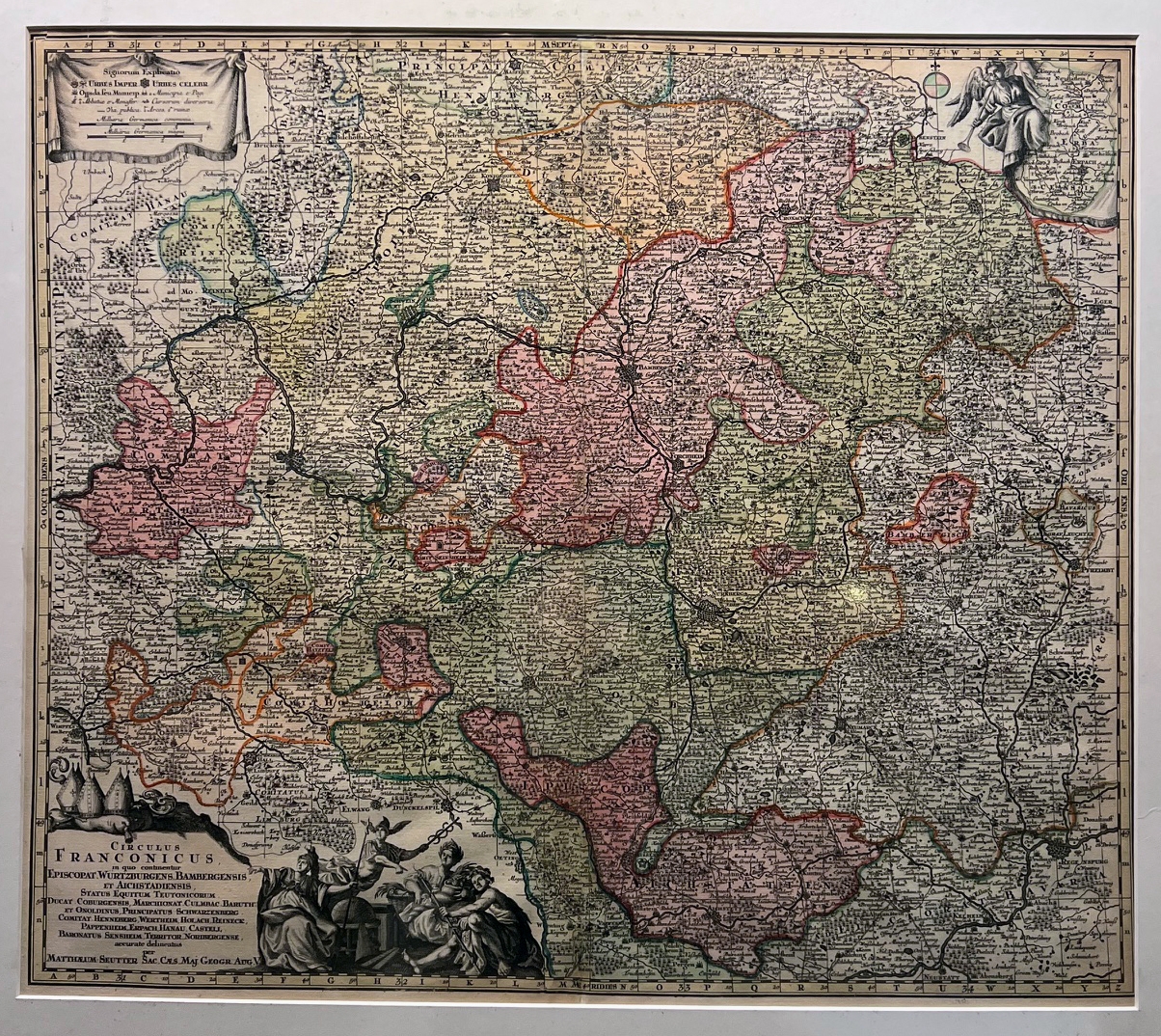 1807-25 FRANKEN - SEUTTER, Matt[häus]. Circulus Franconicus, in quo continentur Episcopat. Würtzburgens., Bambergensis, et Aichstadiensis, Status Equitum Teutonicorum. Ducat. Coburgensis, […] et Onuldinus, Principatus Schwarzenberg […] Mit reicher figürlicher Kartusche. Zeigt das Gebiet von Salmünster bis Wimpfen am Berg und von Ludwigstadt bis Neustadt. Mit kleiner Nebenkarte der Grafschaft Erbach. Von dem Augsburger Verleger und Kupferstecher Matthäus Seutter (1678-1757). | ||